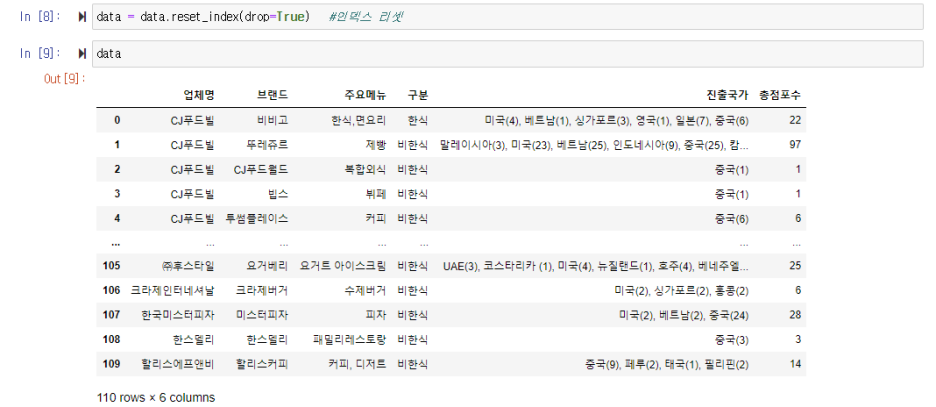 데이터가 보기 좋아졌는데 첫 두 행을 지웠더니 인덱스 번호가 2부터 시작한다. 헷갈리지 않도록 인덱스 번호를 다시 설정해준다.